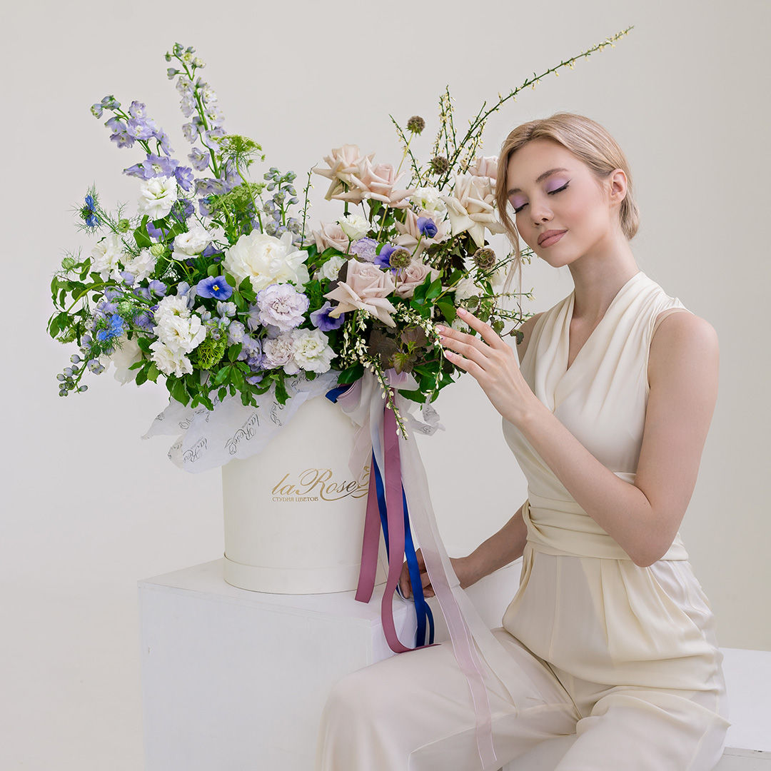 Состав: пион, роза, гвоздика, эустома, дельфиниум, виола, скабиоза, амми, нигелла, питтоспорум, хедера.