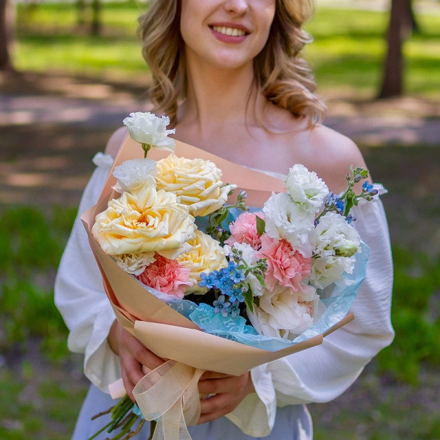 Некоторые цветы и материалы являются сезонными и могут быть недоступны в данный момент, поэтому мы оставляем за собой авторское право определять конечный состав букета.