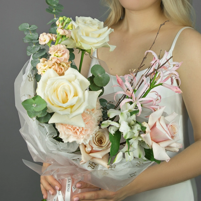 Некоторые цветы в этом букете отсутствуют из-за повышенного спроса или сезонности. Мы ГАРАНТИРОВАННО подберем равноценную альтернативу, сохраняя стиль и цветовую гамму букета. Стоимость и дизайн композиции согласовываются с вами до оплаты заказа. Ваше удовлетворение нашей работой — наш главный приоритет!