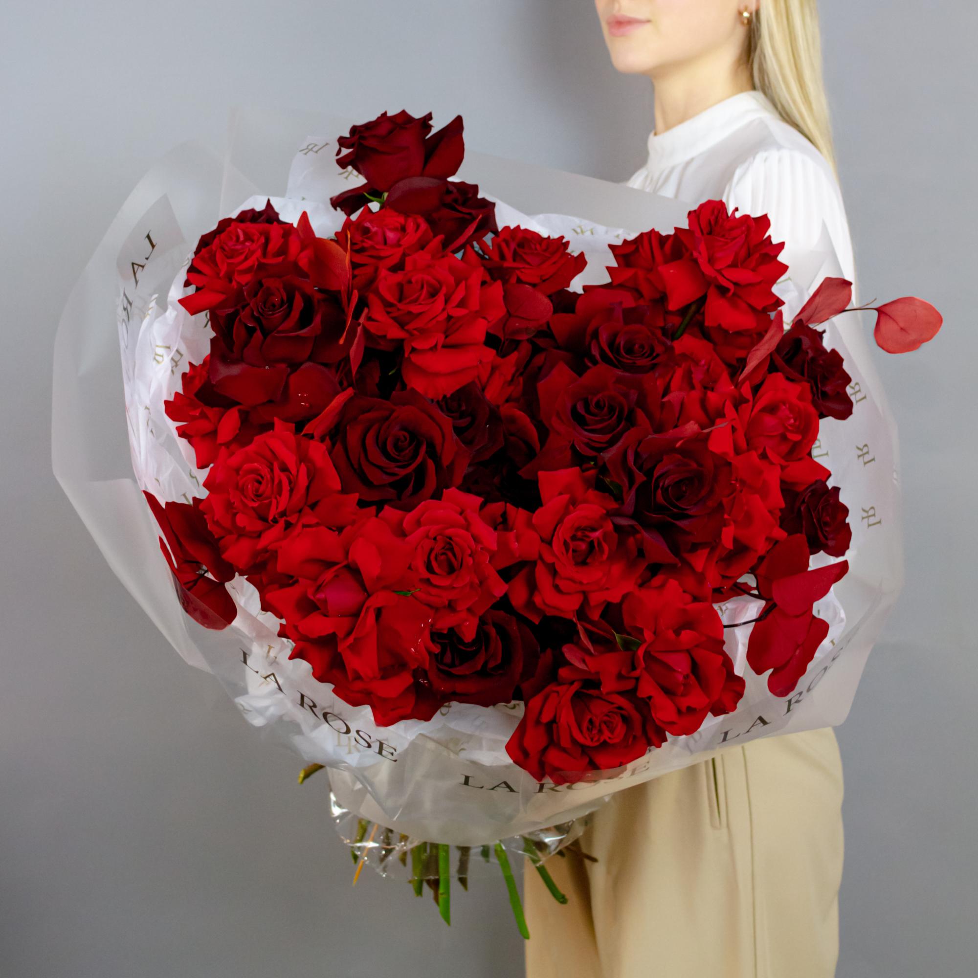 Страстная композиция из элитных сортов Explorer и Nina в благородном красном оттенке. Дополнена стабилизированной цинерией и эвкалиптом для создания драматичного эффекта.