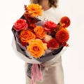 Букет с георгинами и пионовидной розой
