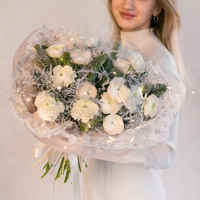 Состав: ранункулюсы, аспарагус, ветка ели