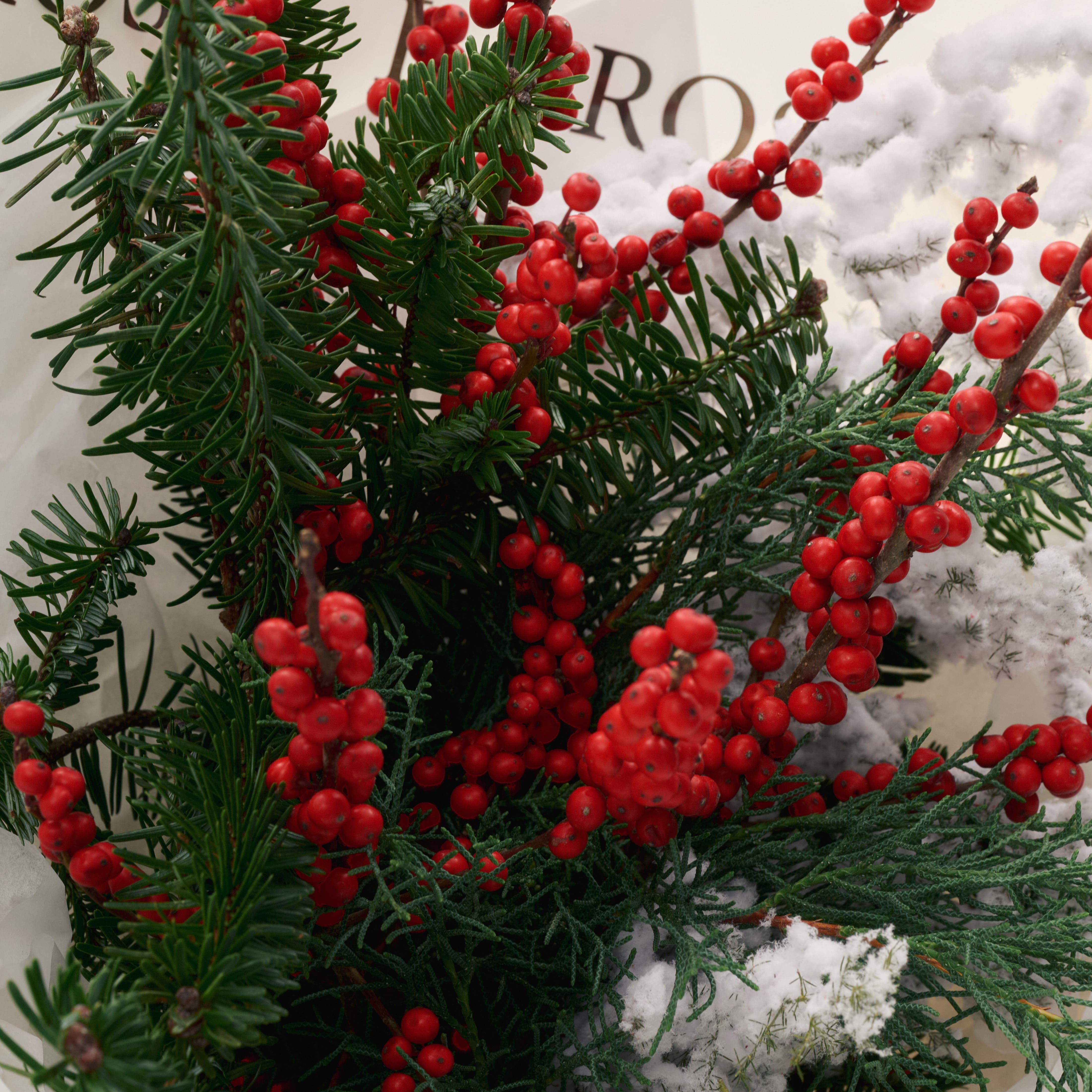 Новогодний букет с заснеженным аспарагусом и ягодами